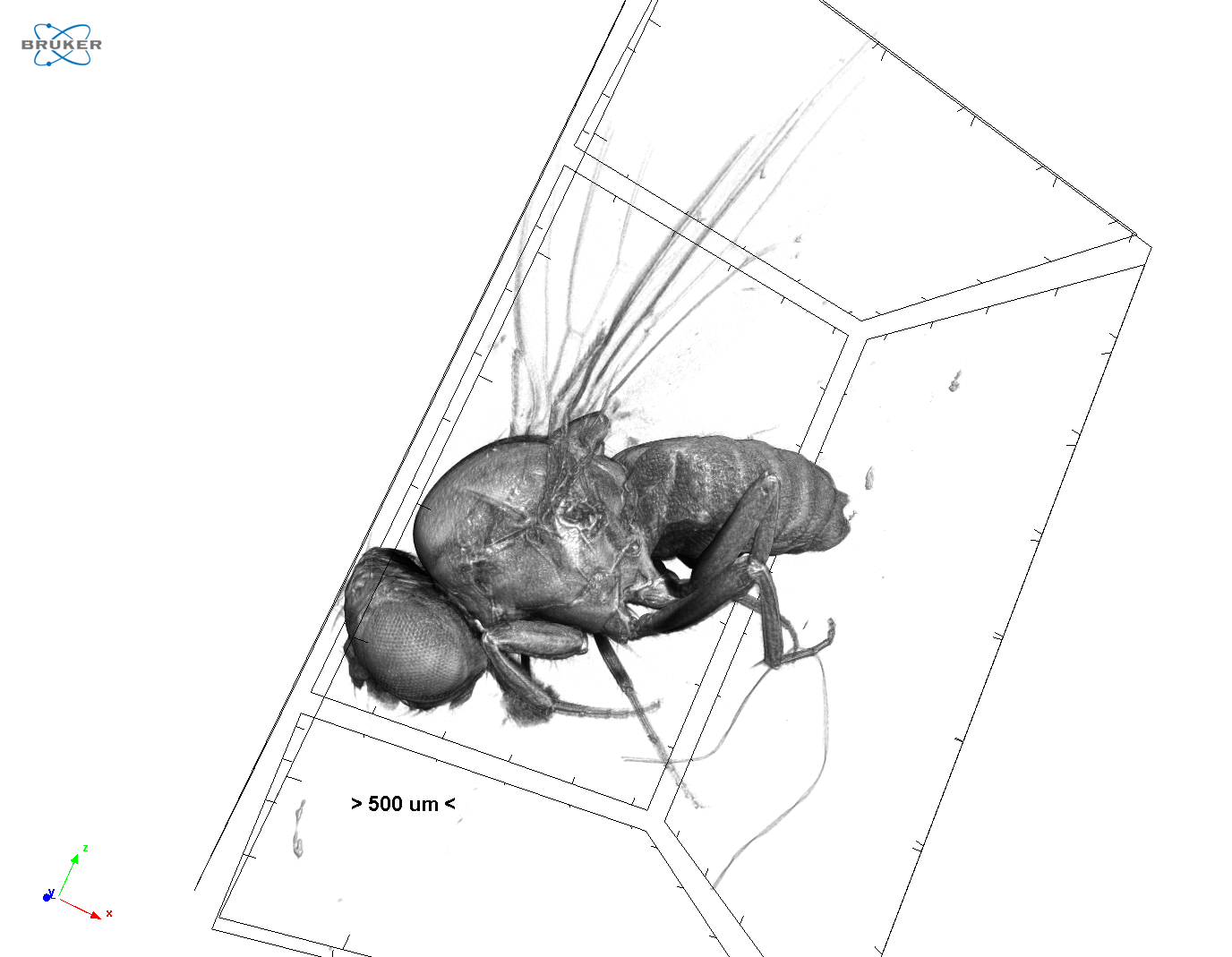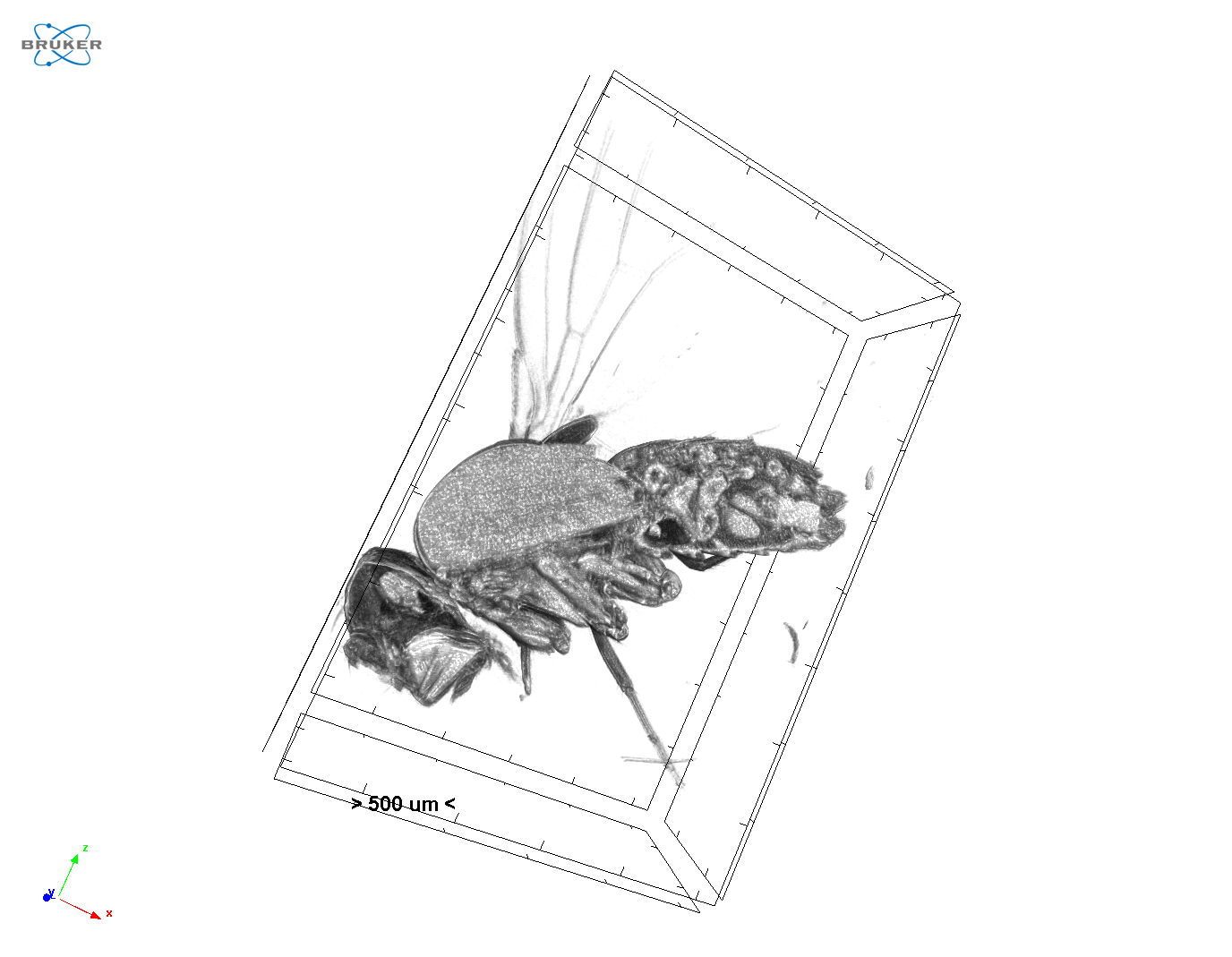 scan-01344Micro-CT was performed to a Drosophila melanogaster. This specimen was fixed in formalin and preserved in 96% ethanol. Specimen was stained with 1% iodine dissolved in 96% ethanol. Scan was performed with a Skyscan 1172 at a voltage of 59kV and 167μΑ without filter for a half rotation of 360o. This specimen was scanned at the highest camera resolution with an exposure time of 650ms. This scan was performed for visualising the heart of the specimen. Specimen was provided by Ioannis Trougakos and scanned by Niki Keklikoglou.